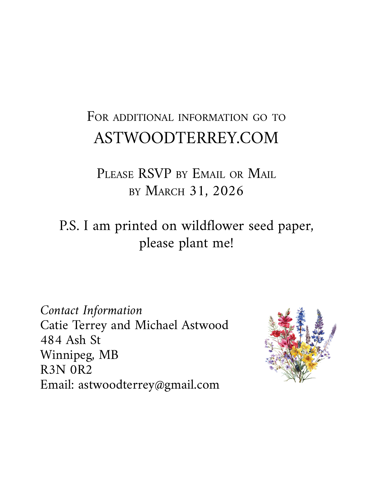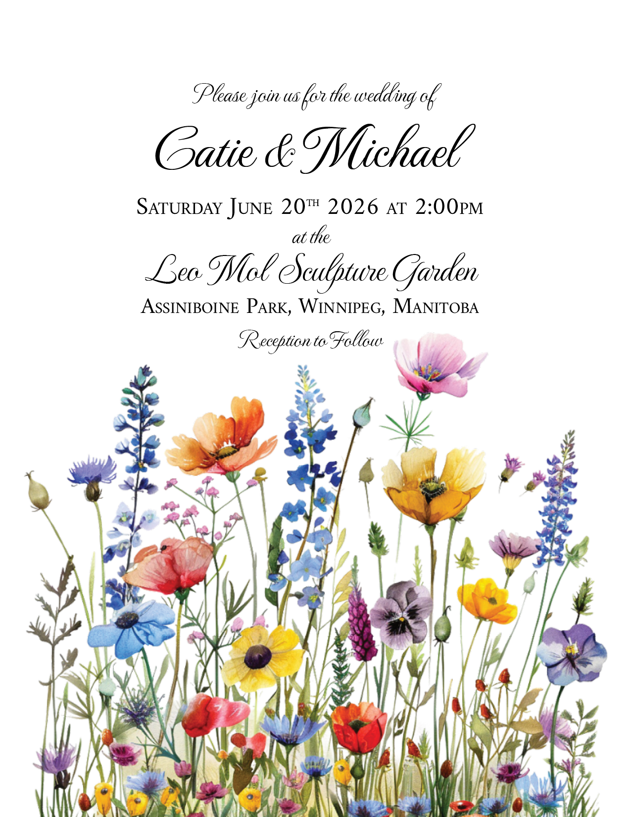 Saturday, June 20th, 2026, at 2:00 PM at the Leo Mol Sculpture Garden in Assiniboine Park. Reception to follow at 122 Old Mill Rd (Michael's Parents) Gifts are welcome but not required.